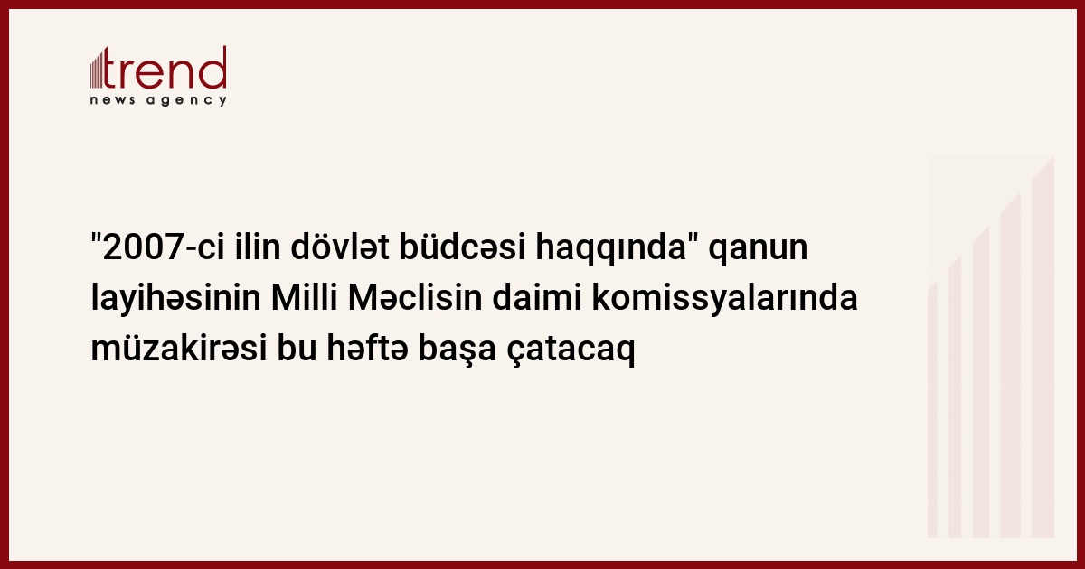 "2007-ci ilin dövlət büdcəsi haqqında" qanun layihəsinin Milli Məclisin daimi komissyalarında müzakirəsi bu həftə başa çatacaq. Trend xəbər verir ki, adıçəkilən sənədin daimi komissyalarda müzakirəsi başa çatdıqdan sonra parlamentin müzakirəsinə çıxarılacaq.