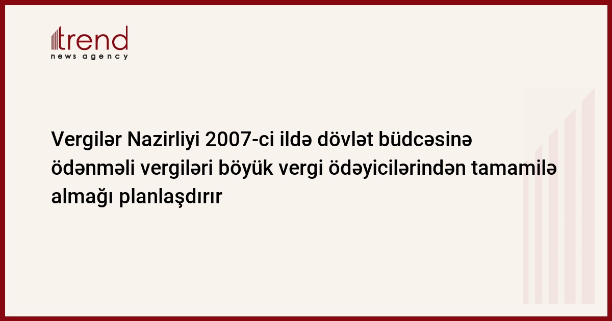 Azərbaycan Vergilər Nazirliyi 2006-cı ilin 9 ayı ərzində böyük vergi ödəyicilərindən daxilolmaların artdığını təsdiq edir. Trend in verdiyi xəbərə görə, bu barədə vergilər naziri Fazil Məmmədov məlumat verib.