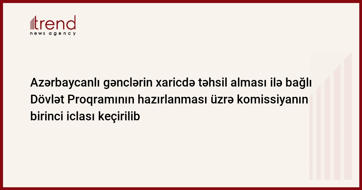 Azərbaycanın iqtisadi inkişaf naziri Heydər Babayevin sədrliyi ilə azərbaycanlı gənclərin xaricdə təhsil alması ilə bağlı Dövlət Proqramının hazırlanması üzrə komissiyanın birinci iclası keçirilib. Trend in İİN-nin məlumatına istinadən xəbər verdiyi kimi, iclasda Maliyyə, Təhsil, Əmək və Əhalinin Sosial Müdafiə, Gənclər və İdman nazirlikləri, o cümlədən Milli Elmlər Akademiyasının vəzifəli şəxsləri və mütəxəssisləri iştirak edib.