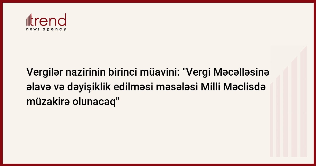 Parlamentin bu həftənin sonunda keçiriləcək iclasında Vergi Məcəlləsinə əlavə və dəyişikliklər müzakirə olunacaq. Trend in məlumatına görə, bu barədə jurnalistlərə vergilər nazirinin birinci müavini Şahin Mustafayev məlumat verib. Ş.Mustafayevin sözlərinə görə, İqtisadiyyat komissiyanın iclasında avtonəqliyyat vasitələrinə aksiz vergilərinin tətbiqi ilə bağlı məsələ Məcəlləyə əlavə və dəyişikliklər sırasında saxlanılıb və buna hansısa dəyişiklik edilməyib: "Biz 82 əlavə və dəyişiklik təqdim etmişik. Düzdür, parlamentdə müəyyən dəyişikliklər çıxarıldı. Amma əsas məqamlar qalır."-deyə o qeyd edib.