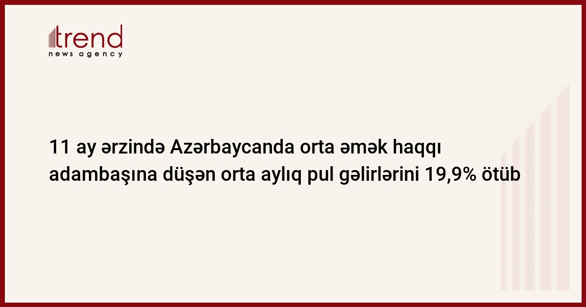 11 ay ərzində orta əmək haqqı adambaşına düşən orta aylıq pul gəlirlərini 71,4% ötüb. Onların həcmi ötən ilin analoji dövrü ilə müqayisədə 21,2% artaraq, 100,3 manat təşkil edib.