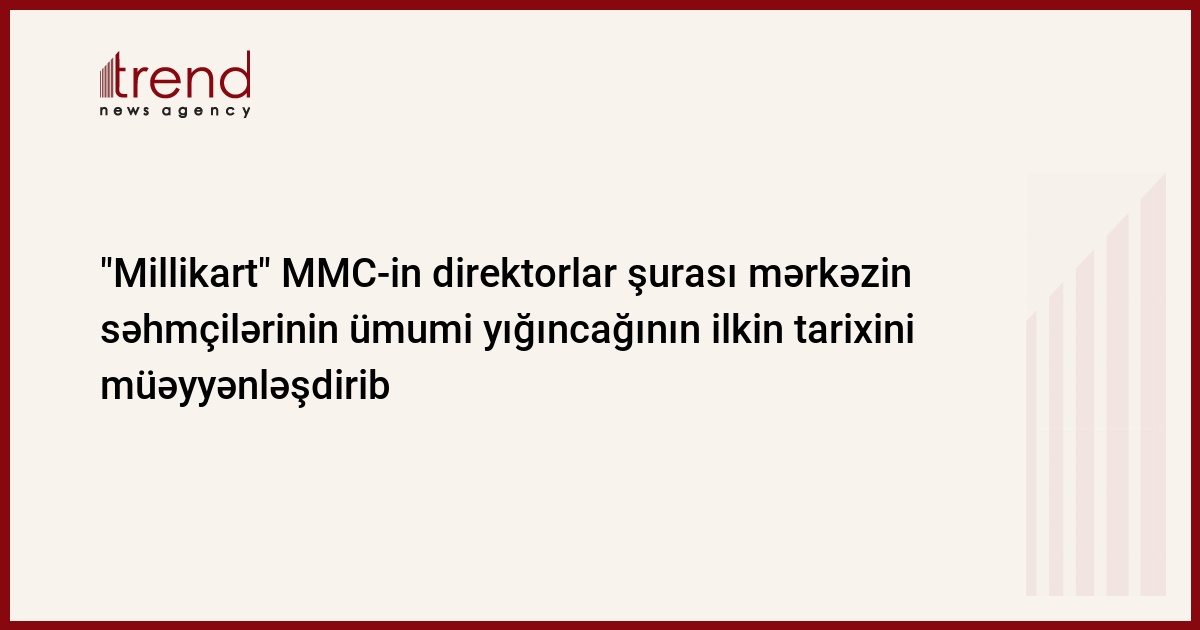 "Millikart" MMC-in direktorlar şurasının növbəti iclasının qərarı ilə kartoçka sistemi ilə ödəmələr mərkəzinin səhmçilərinin ümumi yığıncağının 2007-ci il yanvarın ortasında keçirilməsi planlaşdırılır. "Mərkəz"dən "Trendə" verilən məlumata görə, yığıncaq 2006-cı ilin yekunlarını nəzərdən keçirməyə həsr olunacaq.