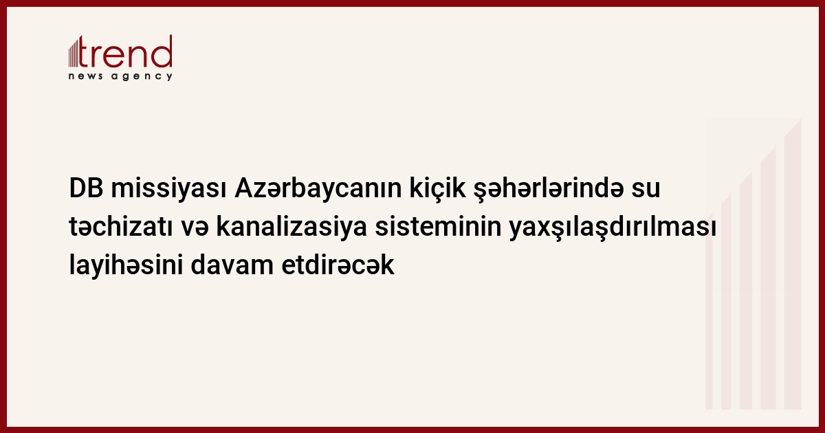 Azərbaycanın kiçik şəhərlərində su təchizatı və kanalizasiya sisteminin yaxşılaşdırılması layihəsinin hazırlanmasının davam etdirilməsi məqsədilə yanvarın 10-dan etibarən DB missiyasının layihələr qrupu rəhbəri Andreas Rodenin başçılığı altında Bakıya səfəri başlanır.