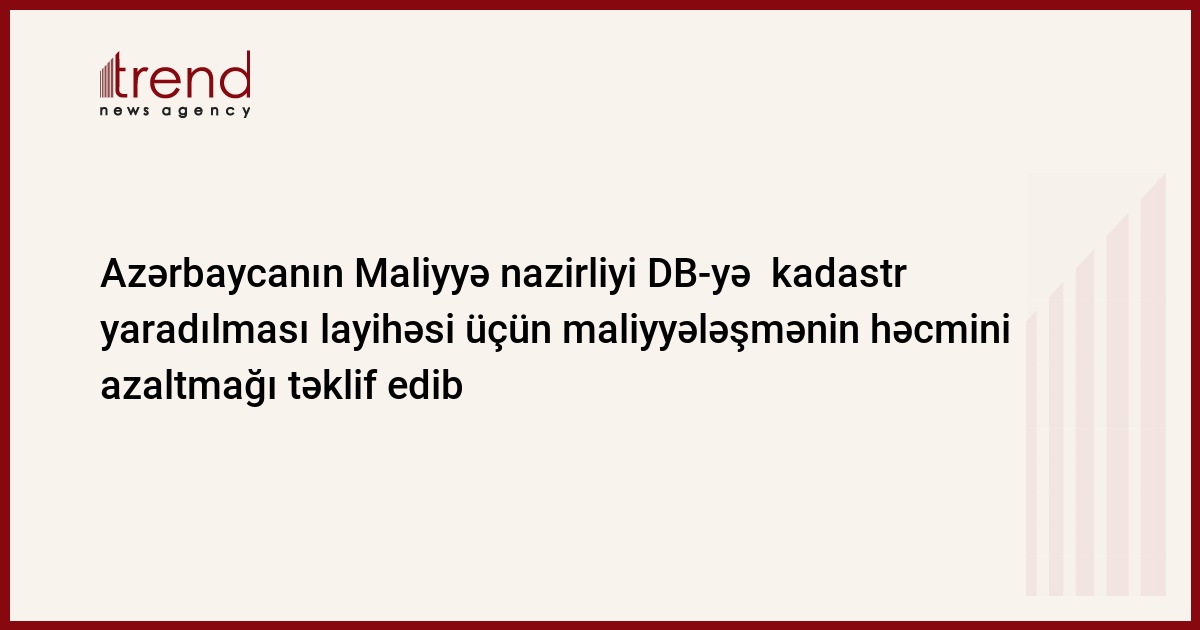 Azərbaycan Maliyyə Nazirliyi Dünya Bankına respublika üzrə torpaq kadastrının yaradılması layihəsinin qiymətləndirilməsi nəticələrinə yenidən baxmağı təklif edib. Maliyyə Nazirliyindən Trend ə verilən xəbərə görə, sonuncu qiymətləndirmədən sonra layihənin dəyəri, uyğun olaraq DB-nın kredit məbləği artıb.