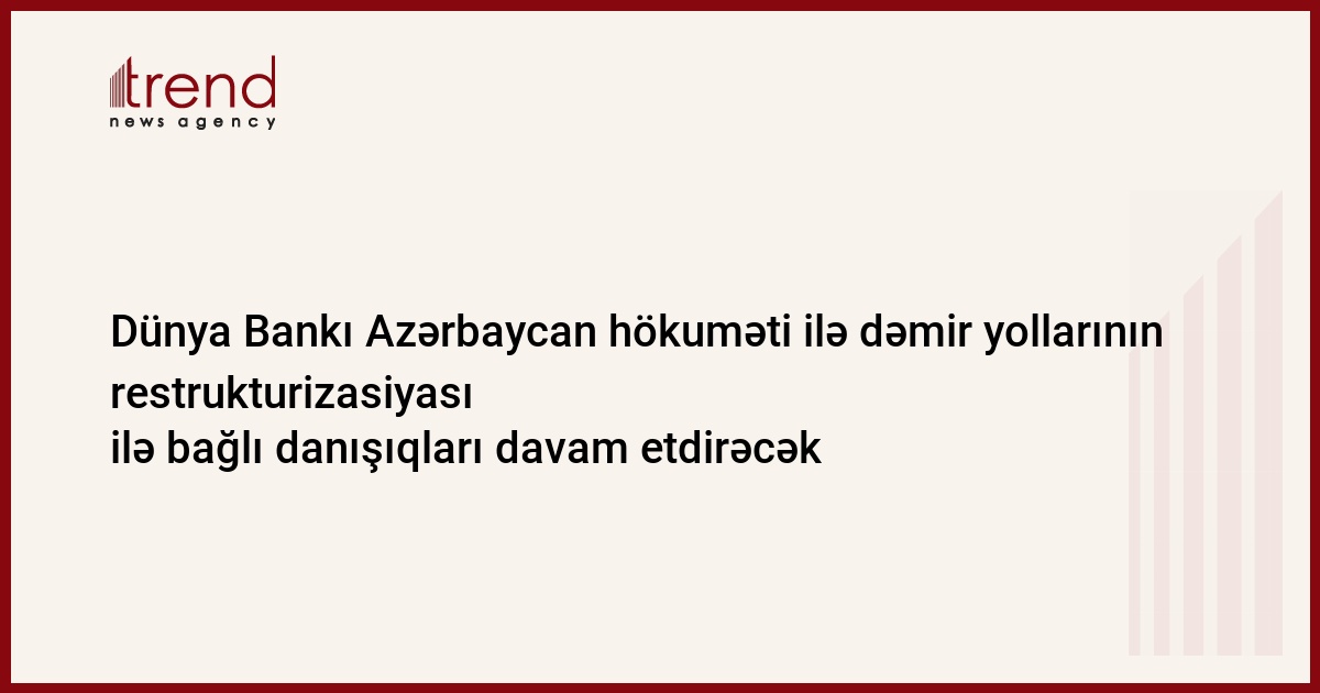 Azərbaycanda dəmir yolları vasitəsilə nəqliyyata və ticarətə yardım layihəsi ilə bağlı danışıqlar Dünya Bankının nəqliyyat üzrə baş mütəxəssisi və layihə rəhbəri Cerald Olivyenin rəhbərliyi ilə Bakıya səfəri zamanı davam etdiriləcək. Trend ə verilən məlumata əsasən, görüş yanvarın 29-da Dünya Bankının Bakı nümayəndəliyində başlayacaq və fevralın 8-nə qədər davam etdiriləcək.