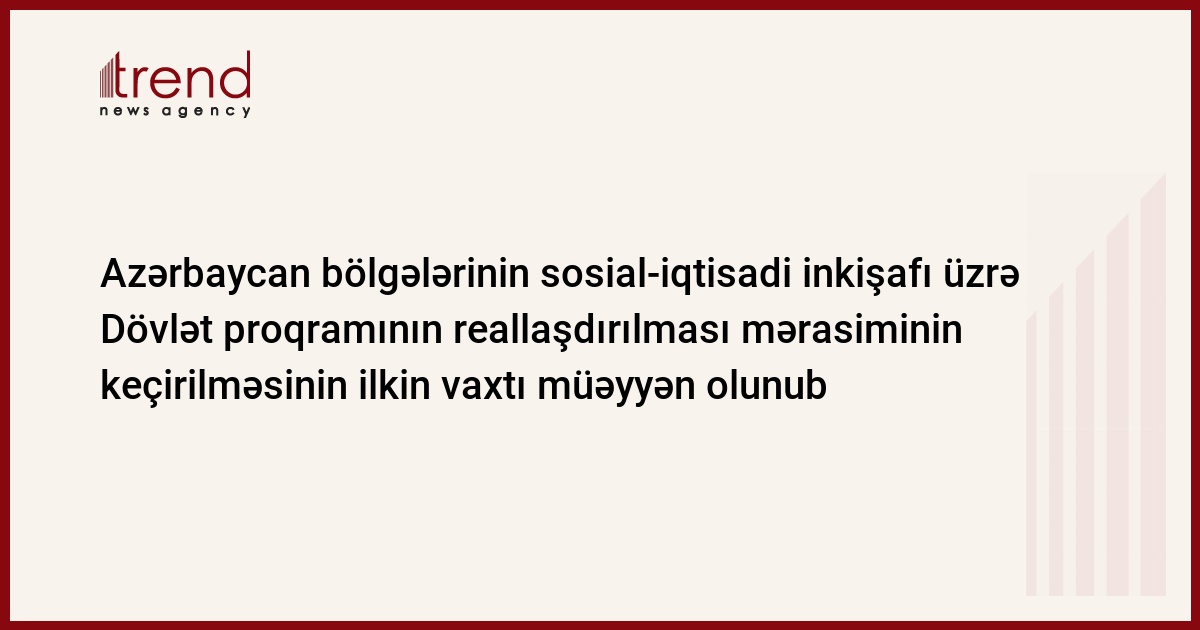 Azərbaycan bölgələrinin sosial-iqtisadi inkişafı üzrə Dövlət proqramının reallaşdırılmasının üç illiyi ilə bağlı tədbirin keçirilməsinin təxmini vaxtı 2007-ci il fevralın ortalarına müəyyənləşdirilib.