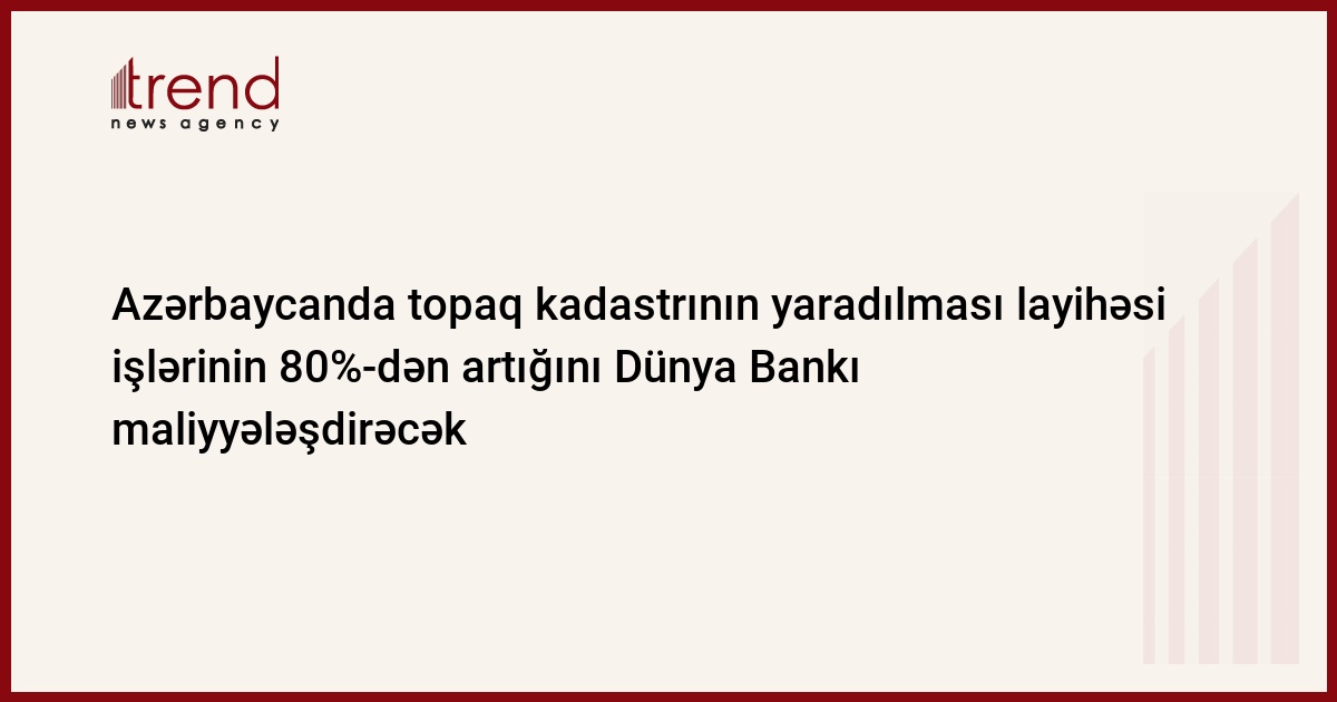Azərbaycan hökuməti və Dünya Bankı (DB) respublika üzrə torpaq kadastrının yaradılması üzrə 38 milyon dollarlıq layihənin yekun dəyərini razılaşdırıb. Bu barədə Trend ə İqtisadi İnkişaf Nazirliyindən məlumat verilib.