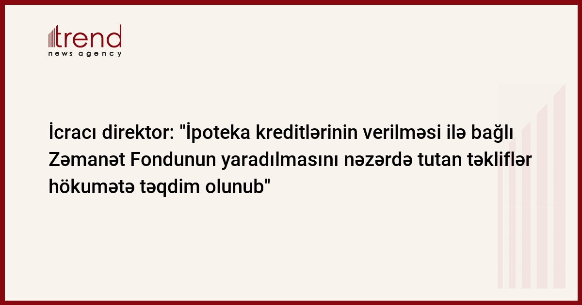 Azərbaycan, Bakı / Trend müxbir İ.Əlizadə/ İpoteka kreditlərinin verilməsi ilə bağlı Zəmanət Fondunun yaradılmasını nəzərdə tutan təkliflər hökumətə təqdim olunub. Bu barədə bazar ertəsi Bakıda Milli Bankın icraçı direktoru Rüfət Aslanlı məlumat verib.