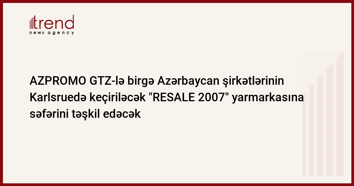 Azərbaycan,Bakı/müxbir Trend İ.Xəlilova/Azərbaycan şirkətləri aprelin 18-də Karlsruedə keçiriləcək 13-cü beynəlxalq yenidən istifadə olunan dəzgah və mexanizmlərin "RESALE 2007" beynəlxalq ticarət yarmarkasında iştirak edəcək. Bu barədə Azərbaycanın İxrac və İnvestisiyaların Təşviqi Fondunun (AZPROMO) prezidenti Emil Məcidov məlumat verib. Şirkətlərin səfərini AZPROMO Almaniyanın Texniki Yardım Cəmiyyəti (GTZ) ilə birgə təşkil edir.