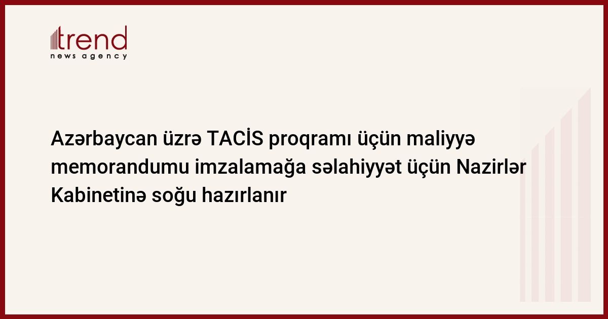 Azərbaycan, Bakı/ Trend müxbir İ.Xəlilova/ Azərbaycanın İqtisadi İnkişaf Nazirliyi 2006-cı maliyyə ili üçün TACİS milli fəaliyyət planı üzrə maliyyə memorandumu imzalamaq üçün səlahiyyət almaq məqsədilə Nazirlər Kabinetinə sorğu təqdim etməyə hazırlaşır. Bu barədə cümə günü Nazirlikdən məlumat veriblər. Səlahiyyətin Avropa Komissiyasında Azərbaycan üzrə koordinator olan iqtisadi inkişaf naziri Heydər Babayevə verilicəyi güman edilir.