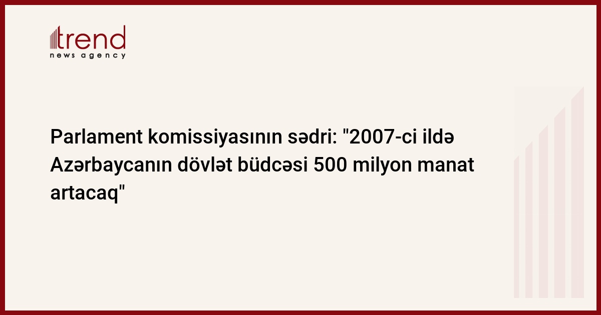 Azərbaycan, Bakı /müx. Trend İ.Əlizadə / 2007-ci ildə Azərbaycanın dövlət büdcəsi minimum 500 mln. manat artırılacaq. Bunu çərşənbə axşamı Milli Məclisin İqtisadi siyasət daimi komissiyasının sədri, deputat Ziyad Səmədzadə deyib.