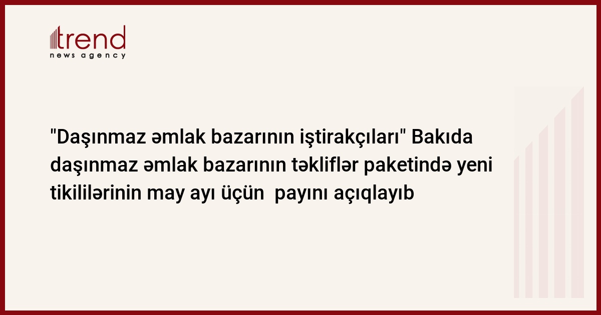 Azərbaycan, Bakı /müx. Trend Ü.İsmaylova/ "Daşınmaz əmlak bazarının iştirakçıları" ictimai təşkilatının məlumatında bildirilir ki, may ayında Bakının daşınmaz əmlak bazarında qeyri-mövsümi göstəricilər səbəbindən nisbi sabitlik müşahidə olunub. May ayında "Azeri-REİ" daşınmaz əmlak bazarının göstəricisi 1,2 % artıb və 282,8 nöqtəsində dayanıb ki, bu da əsasən torpaq bazarının hesabına əldə edilib. İkinci dərəcəli əmlak bazarında inkişaf indeksi 0,3 % təşkil edib və bu, 2006-cı ilin analoji dövrünün göstəriciləri ilə eynidir. İkinci dərəcəli bazarda orta qiymət bir kvadratmetr üçün 1215 dollar təşkil edib. Qiymət artımı əsasən Bakının birinci zonasında müşahidə edilib, ikinci və üçüncü zonalarda isə sabitlik müşahidə edilir. Artım əsasən "memarlıq" tikintilərində müşahidə edilib ki, bu da onların şəhərin birinci zonasında yerləşməsi ilə bağlıdır. Təkliflər paketində yeni tikililərin payı 14,8%, "Leninqrad" layihəli evlərin payı isə 32,2% təşkil edib.