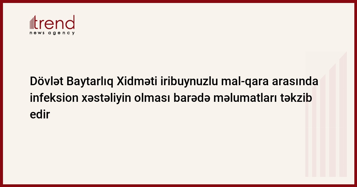 Azərbaycan, Bakı/ Trend müxbir S.Babayeva/ Kənd Təsərrüfatı Nazirliyi yanında Dövlət Baytarlıq Xidməti Azərbayacanın Siyəzən rayonunda, xüsusilə "Orxan" özəl damazlıq təsərrüfatında iribuynuzlu mal-qara arasında infeksion xəstəliyin olması barədə KİV-də yayılmış məlumatları təkzib edir.