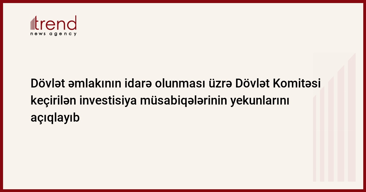 Azərbaycan, Bakı/ Trend müxbir Ü.İsmayılova/ Dövlət əmlakının idarə olunması üzrə Dövlət Komitəsi keçirilən investisiya müsabiqələrinin yekunlarını açıqlayıb. Bu barədə komitənin məlumatında göstərilib.
