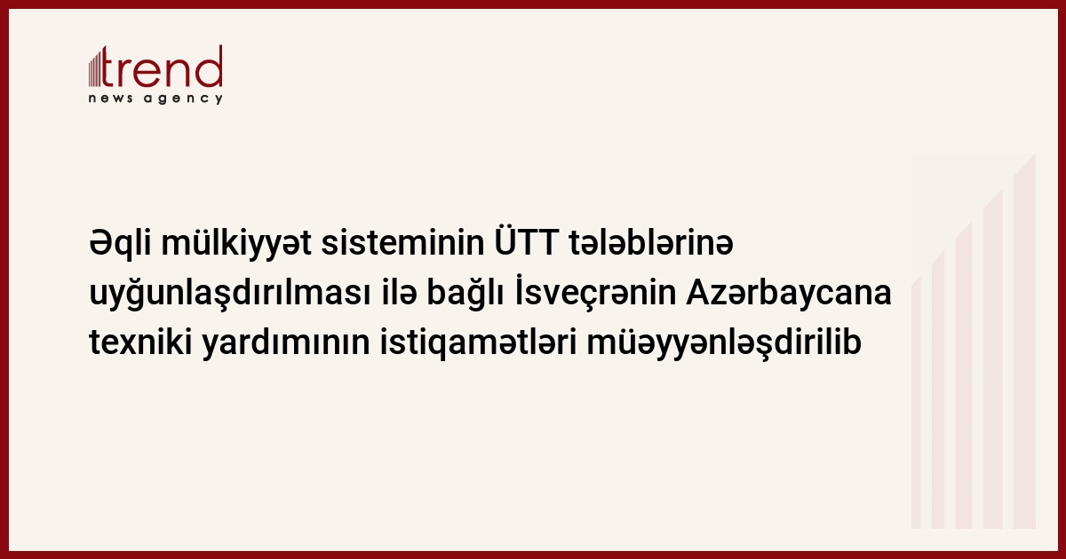 Azərbaycan, Bakı / Trend , müxbir İ.Xəlilova / İsveçrə hökuməti 2008-ci ilin əvvəlindən Azərbaycanda əqli mülkiyyət sisteminin Ümumdünya Ticarət Təşkilatının (ÜTT) tələblərinə uyğunlaşdırılması məqsədilə texniki yardıma başlayacaq. Bu barədə Xarici İşlər Nazirliyindən məlumat veriblər.
