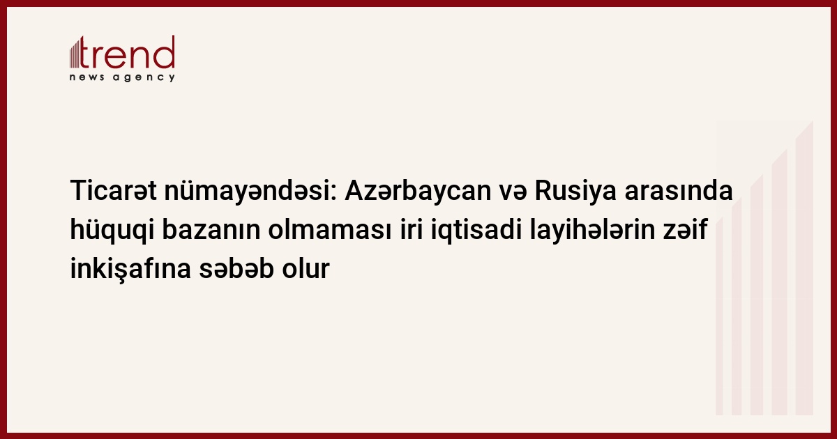 Azərbaycan, Bakı/ Trend müxbir İ.Xəlilova/ İnvestisiya sahəsində Azərbaycan və Rusiya arasınada hüquqi bazanın olmaması böyük investisiya tələb edən iri laxyihələrin zəif inkişafına səbəb olur. Bunu cümə günü RF-nin Azərbaycandakı ticarət nümayəndəsi Yuri Şedrin bildirib.