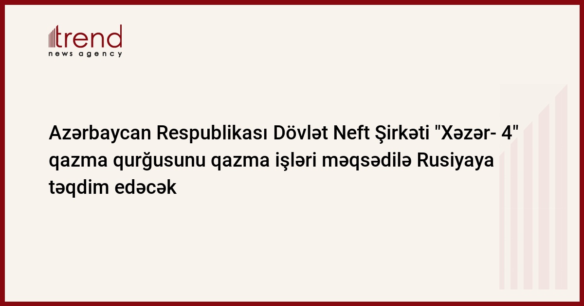 Azərbaycan, Bakı / Trend müxbir S.Əliyev / Cümə günü ARDNŞ-dan verilən məlumata görə, Azərbaycan Respublikası Dövlət Neft Şirkəti "Xəzər- 4" özüqalxan qazma qurğusunun "Timan Oil and Gas PLS" şirkətinə icarəyə verilməsi ilə əlaqədar olaraq xüsusi komissiya yaradıb. Məqsəd Xəzərin Rusiya sektorunda "İzerbaş" müqavilə sahəsində yerləşən iki saylı blokda qazma işlərinin aparılmasıdır.