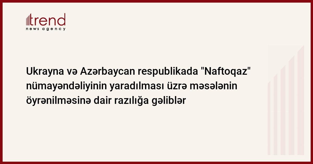 Ukrayna, Kiyev, 25 yanvar / " müxbir Z.Novosvitski/ Ukrayna və Azəərbaycan "Naftoqaz Ukrainı" şirkətinin Azərbaycanda nümayəndəliyinin yaradılmasının mümkünlüyünü təcili öyrənilməsinin zərurəti barədə razılığa gəliblər. Ukraynanın Yanacaq və Energetika Nazirliyindən verilən məlumata görə, razılaşma yanvarın 24-də Azərbaycanın Ukraynadakı Fövqəladə və Səlahiyyətli səfiri Tələt Əliyevin adı çəkilən ölkənin yanacaq və energetika naziri Yuri Prodan ilə görüşü zamanı əldə olunub.