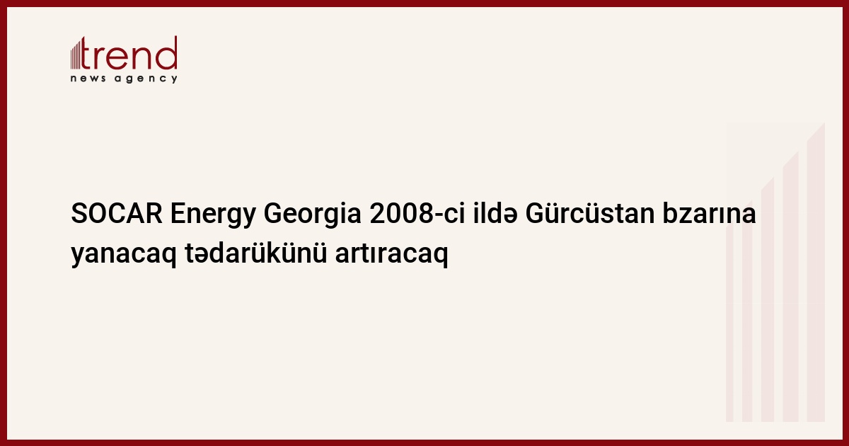 Azərbaycan, Bakı, 14 mart/ Trend , müxbir S.Əliyev/ 2008-ci ildə Azərbaycan Dövlət Neft Şirkətinin (ARDNŞ) törəmə müəssisəsi olan SOCAR Energy Georgia Şirkəti Gürcüstan bazarına yanacaq tədarükünü ən azı 150 min tondan 350 min tonadək artıracaq. Bu barədə cümə günü Bakıda SOCAR Energy Georgia Şirkətinin rəhbəri Mahir Məmmədov məlumat verib.