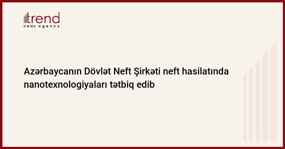 Azərbaycan, Bakı, 06 may/ Trend / Azərbaycanın Dövlət Neft Şirkəti (ARDNŞ) xammal hasilatı zamanı nanotexnologiyaların təcrübi tətbiqi hesabına, quyulardan əlavə olaraq 300 ton neft əldə edib. ARDNŞ-nin çərşənbə axşamı yayılan məlumatında bildirilir ki, bu üsul "Qum Adası", "Suraxanıneft" və "Abşeronneft" NQÇİ-nin istismar etdiyi quyularda sınaqdan keçirilib.