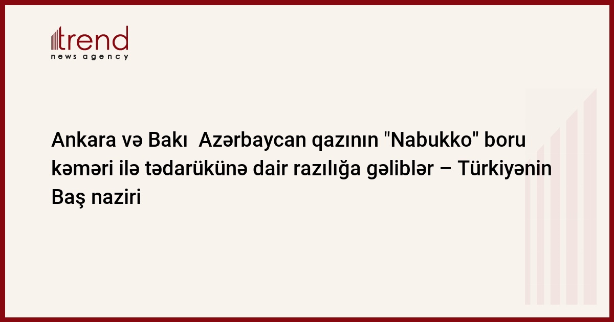 Azərbaycan, Bakı, 04 iyun/ Trend , müxbir M.Quliyev/ Türkiyə və Azərbaycan, Azərbaycanın qazının bir hissəsinin Cənubi Qafqaz boru kəməri ilə yanaşı, digər boru kəməri ilə də - Avropa İttifaqının dəstəklədiyi "Nabukko" boru kəməri ilə tədarükünə dair razılığa gəliblər. "Ankara və Bakı Azərbacyan qazının bir hissəsini "Nabukko" qaz kəmərinə yönəltmək qərarına gəliblər", - Türkiyən Baş naziri Rəcəb Tayyib Ərdoğan çərşənbə günü jurnalistlərə bildirib.