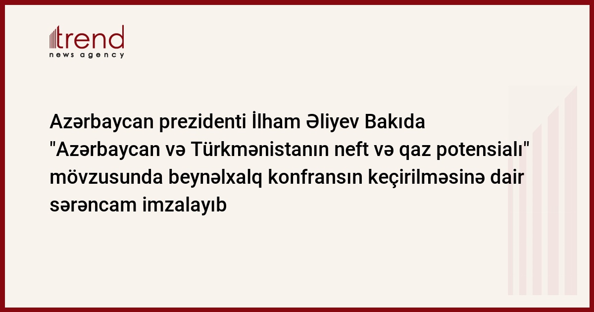 Azərbaycan, Bakı, 18 iyun / Trend / Azərbaycan prezidenti İlham Əliyev sentyabrda Bakıda "Azərbaycan və Türkmənistanın neft və qaz potensialı: energetika, iqtisaddiyyat, ekologiya. Əməkdaşlıq strategiyası" mövzusunda beynəlxalq konfransın keçirilməsinə dair sərəncam imzalayıb.