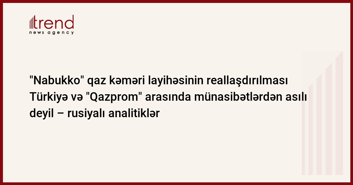 Beynəlxalq Maliyyə Qrupu UniCredit Group-un bir hissəsi olan "YuniKredit Aton" şirkətinin analitiki Pavel Sorokin hesab edir ki, "Qazprom" və Türkiyə arasında əməkdaşlığın möhkəmlənməsi "Nabukko" layihəsinə güclü təsir etməyəcək.