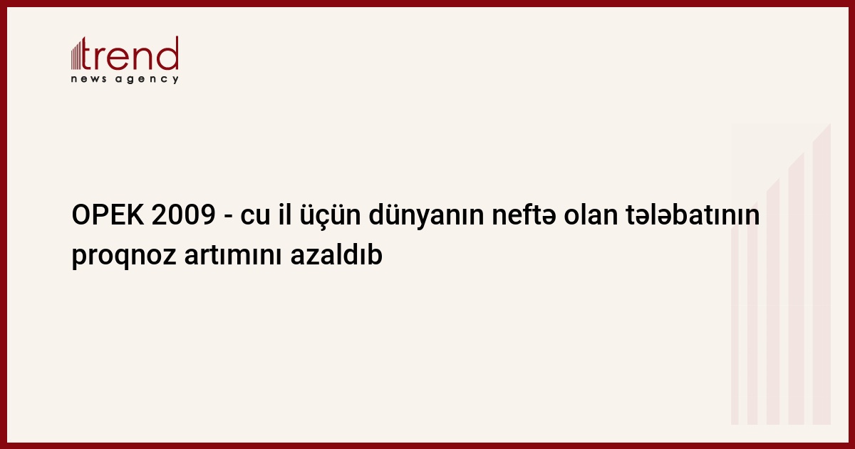 Azərbaycan, Bakı, 16 oktyabr/ Trend , müxbir A.Bədəlova/ OPEK 2009 - cu il üçün dünyanın neftə olan tələbatının proqnoz artımını sutkada 0,1 mln. barel və 2008 - ci il üçün sutkada 0,33 mln. barel azaldıb. Kartelin neft bazarı üzrə dərc etdiyi məruzədəki yeni proqnozlara əsasən, növbəti ildə dünyanın xammal tələbatı sutkada 0,8 mln. bareldən 87,2 mln.barelədək artacaq. Bu il neft tələbatı 0,55 mln.artımla, sutkada 86,5 mln.barel təşkil edəcək.