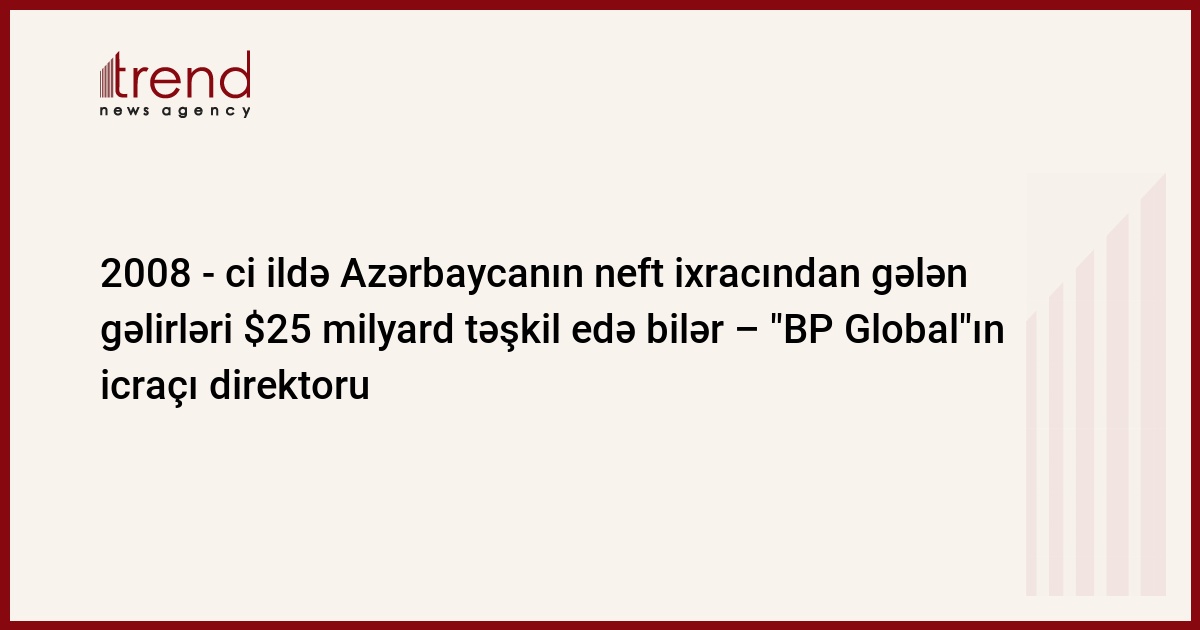Azərbaycan, Bakı, 17 oktyabr/ Trend , müxbir A.Bədəlova/ Dünya bazarlarında neftin bir barelinin qiymətinin 100 dollar olduğu vaxtda 2008 -ci ildə Azərbaycanın neft ixracından gələn gəlirləri 25 milyard dollar təşkil edəcək. Bu barədə "BP Global"ın kəşfiyyat və hasilat üzrə icraçı direktoru Endi İnglis (Andy Inglis) bildirib. Onun bu barədə söhbəti BP-nin rəsmi saytında yerləşdirilib.
