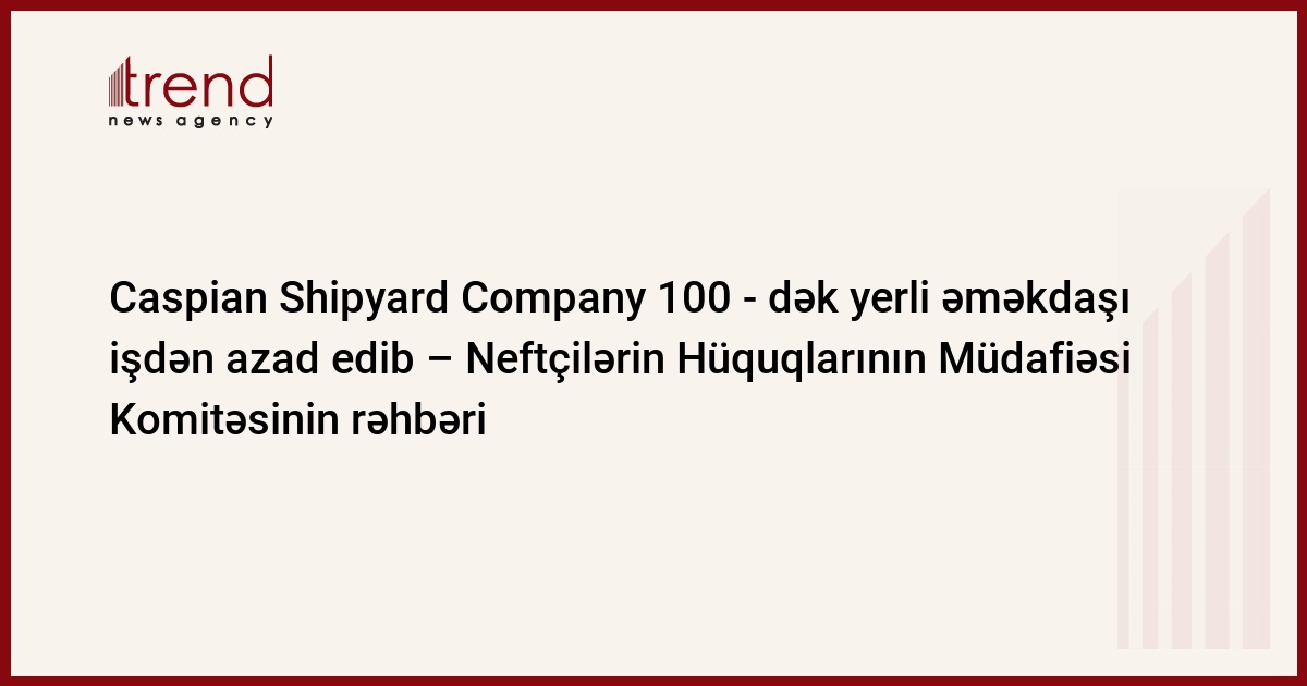 Azərbaycan, Bakı, 21 noyabr/ Trend , müxbir E.İsmayılov/ "Cari ilin iyunundan -- Caspian Shipyard Company (CSC) neft servisi şirkətinin yerli əməkdaşlarının tətilindən indiyədək şirkətdən təxminən 100 nəfər işdən azad edilib, - Neftçilərin Hüquqlarının Müdafiəsi Komitəsinin rəhbəri Mirvari Qəhrəmanlı cümə günü keçirilmiş mətbuat konfransında bildirib.