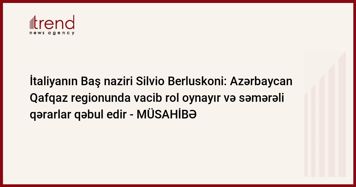 Azərbaycan, Bakı, 26 noyabr/ Trend , müxbir E.Ostapenko/ Çərşənbə axşamı Azərbaycan prezidenti İlham Əliyevin İtaliyaya rəsmi səfəri başlamışdır. İtaliyanın Baş naziri Silvio Berluskoni Trend a eksklüziv müsahibəsində Azərbaycanla siyasi və iqtisadi əməkdaşlığın perspektivləri və ölkənin Aİ-yə qazın çatdırılması diversifikasiyası barədə danışmışdır.