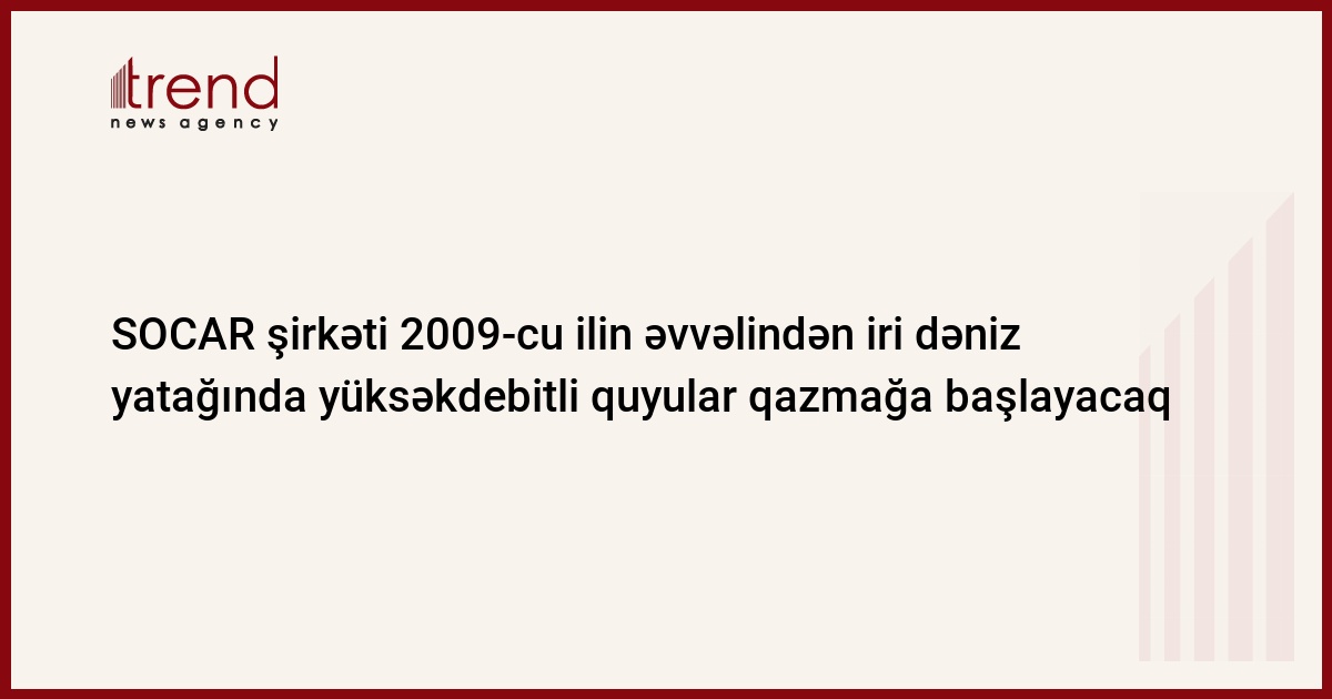 Azərbaycan, Bakı, 01 dekabr/ Trend , müxbir E.İsmayılov/ SOCAR şirkətinin (Azərbaycan Dövlət Neft Şirkəti) "Bayıl limanı" Dəniz Qazma İşləri İdarəsi 2009-cu ilin əvvəlindən SOCAR tərəfindən müstəqil şəkildə istismar olunan "Günəşli" dəniz yatağında iki yüksəkdebitli qaz quyusu qazmağa başlayacaq. Bu barədə bazar ertəsi şirkətdəki mənbədən bildiriblər.
