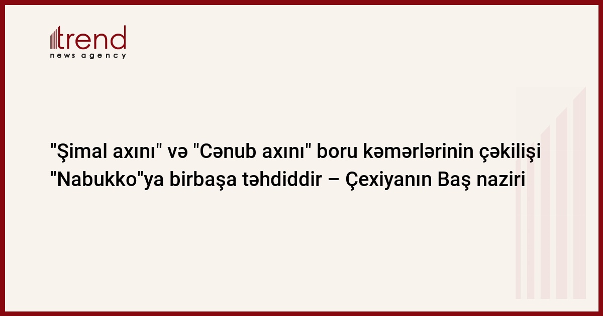 Azərbaycan, Bakı, 27 yanvar/ Trend / Rusiyanın "Qazprom" şirkətinin dəstəklədiyi "Şimal axını" və "Cənub axını" boru kəmərlərinin çəkilişi "Nabukko" layihəsinə birbaşa təhdiddir. Belə ki, bu kəmərlər Avropanı potensial yeni qaz tədarükü mənbələrindən məhrum edir, - Avropa İttifaqına sədrlik edən Çexiyanın Baş naziri Mirek Topolanek bildirib. O, çərşənbə axşamı Budapeştdə belə bəyanatla çıxış edib. Budapeştdə Avropanın Rusiya qazından asılılığını azaltmaq üçün nəzərdə tutulmuş alternativ "Nabukko" qaz kəməri layihəsi üzrə konfrans keçirilir, - RBK xəbər verir.