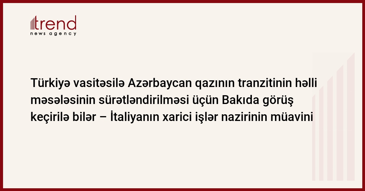 Azərbaycan, Bakı, 03 mart / Trend / İtaliyanın xarici işlər nazirinin müavini Alfredo Mantika Türkiyə vasitəsilə Azərbaycan qazının tranzitinin həlli məsələsinin sürətləndirilməsi üçün İtaliya və Türkiyə baş nazirlərinin iştirakı ilə Bakıda üçtərəfli görüşün keçirilməsi təklifi ilə çıxış edib. Bu təklif Azərbaycanın sənaye və energetika naziri Natiq Əliyev ilə görüş zamanı səsləndirilib. Bu barədə çərşənbə axşamı Sənaye və Energetika Nazirliyinin mətbuat katibi Azər Mənsimli bildirib.