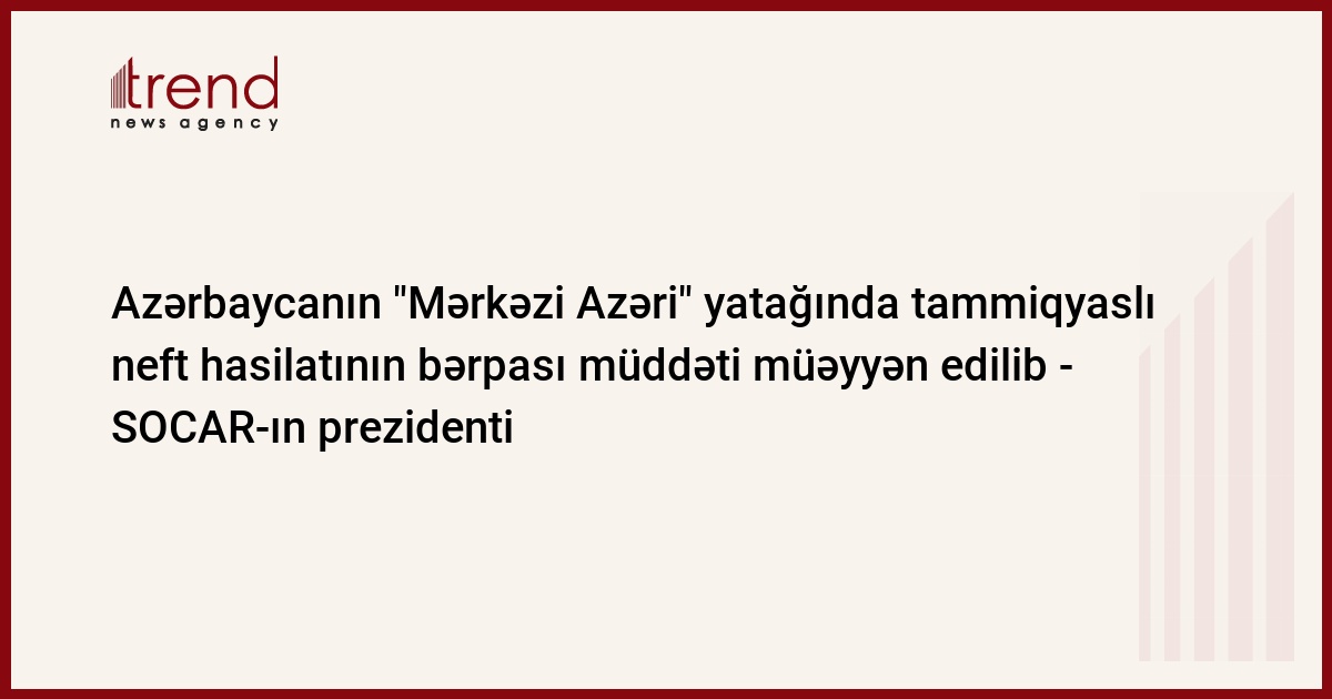 "Qaz sızması səbəbindən hasilatı dayandıran Azərbaycanın "Mərkəzi Azəri" dəniz yatağındakı platformanın tam iş rejimi apreldə bərpa olunacaq", - şənbə günü SOCAR-ın (Azərbaycan Dövlət Neft Şirkəti) prezidenti Rövnəq Abdullayev deyib.