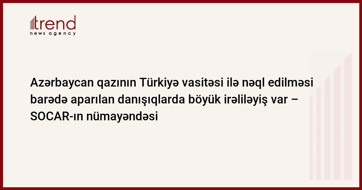 Azərbaycan qazının Türkiyə vasitəsi ilə nəql edilməsi və "Şah Dəniz" yatağının işlənilməsinin ikinci mərhələsi çərçvəsində Türkiyəyə satılacaq qazın şərtləri barədə Azərbaycan-Türkiyə danışıqlarında böyük irəliləyiş var. Bu barədə SOCAR-ın yüksək vəzifəli nümayəndəsi bildirib.