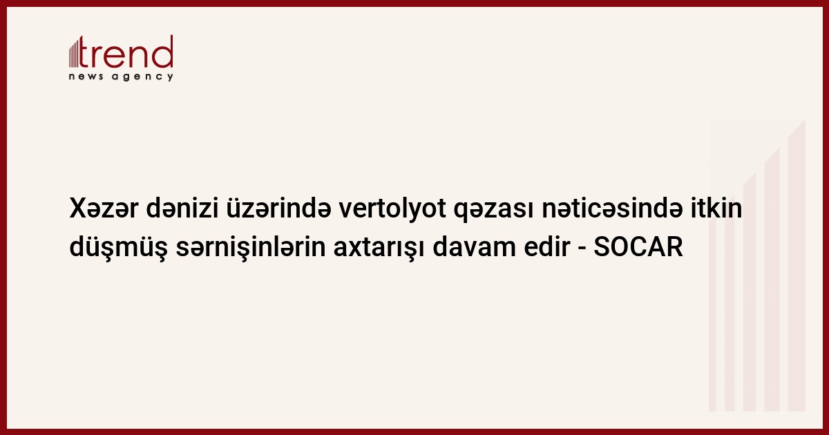 İyulun 12-də Xəzər dənizi üzərində qəzaya uğramış Mİ-8 vertolyotunun iki sərnişininin axtarışı hələ də davam edir. İşə SOCAR-ın Xəzər Dəniz Neft Donanmasının gəmiləri və dalğıcları cəlb olunub. Bu barədə Dövlət Neft Şirkətindən bazar ertəsi bidirilib.