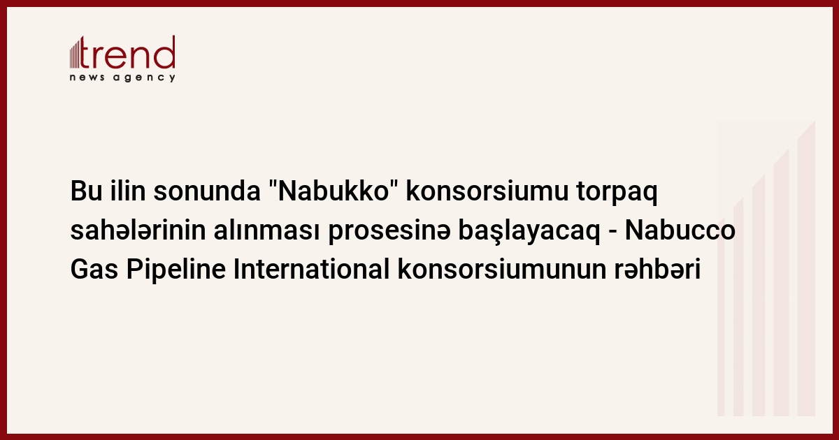 Bu ilin sonunda "Nabukko" layihəsi konsorsiumu qaz kəməri marşrutunun keçəcəyi torpaq sahələrinin alınması prosesinə başlayacaq. Bu barədə çərşənbə günü Nabucco Gas Pipeline International konsorsiumunun direktoru Reynhard Mitçek bildirib.