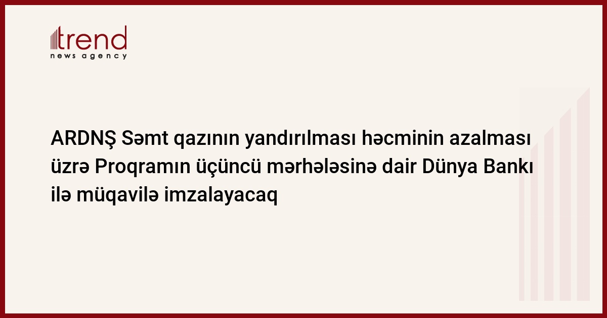 Dekabrın 2-dən 9-dək Səmt qazının yandırılması həcminin azalması üzrə Qlobal Proqram (GGFR) çərçivəsində Dünya Bankının (DB) missiyası Bakıya gələcək. Bu barədə çərşənbə günü bankın Bakı nümayəndəliyindən deyilib.