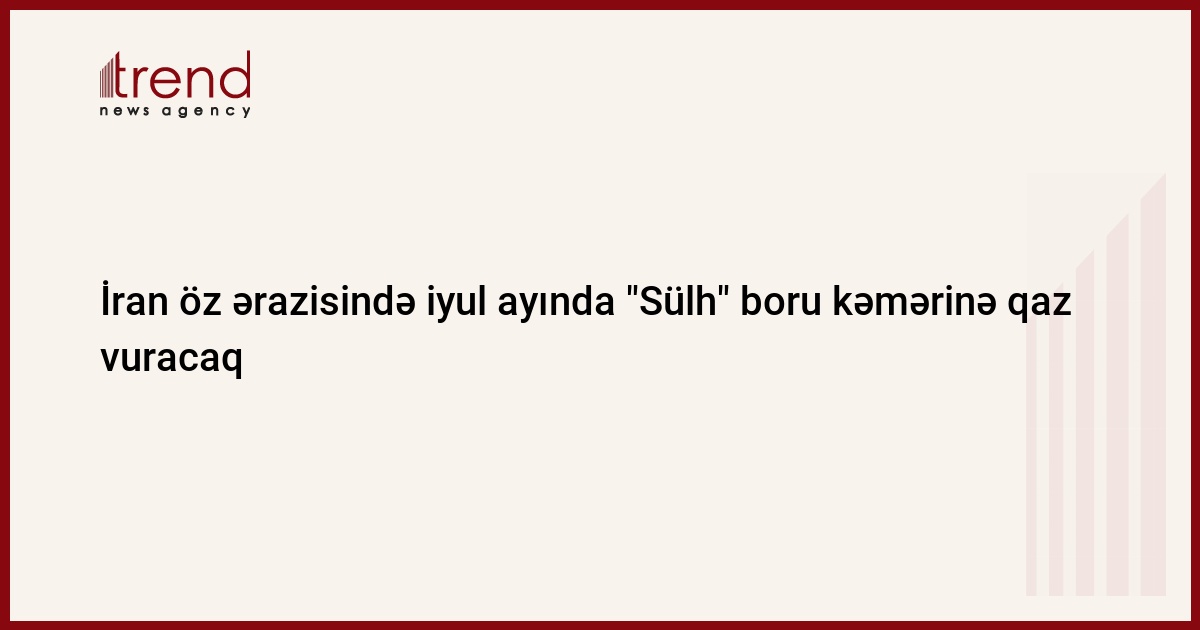 Iyul ayına qədər İran ərazisindən keçən "Sülh" boru kəmərinin bir hissəsi tikilib qurtarılacaq və o qazla doldurulacaq. Bu barədə LİNA agentliyi məlumat verir.