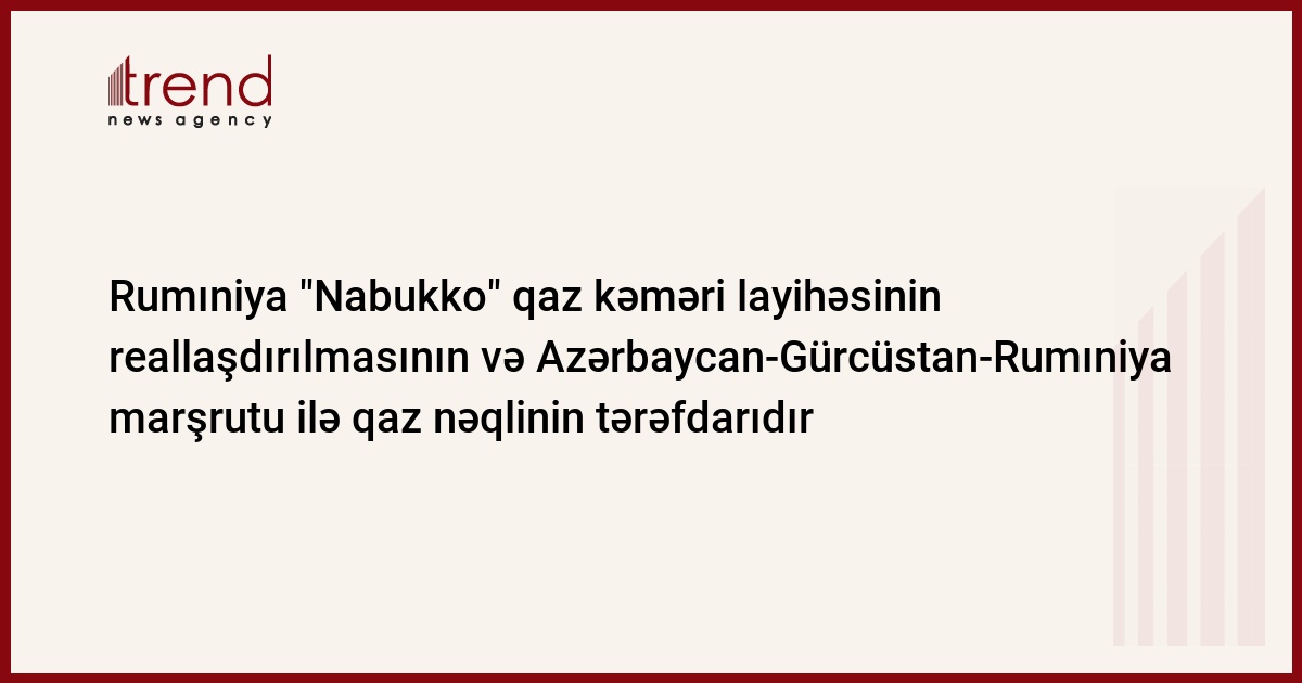Avropa Şurasının üzvü kimi Rumıniya azad bazar sisteminin tətbiq edilməsinin tərəfdarıdır. Bu kontekstdə "Nabukko" qaz kəməri layihəsinin reallaşdırılmasının və Azərbaycandan Gürcüstan - Qara dəniz vasitəsilə Rumıniyaya qaz nəqlinin tərəfdarıdır. Bunu Rumıniyanın xarici işlər naziri Teador Bakonski Azərbaycanın xarici işlər naziri Elmar Məmmədyarovla birgə keçirilən mətbuat konfransında deyib.