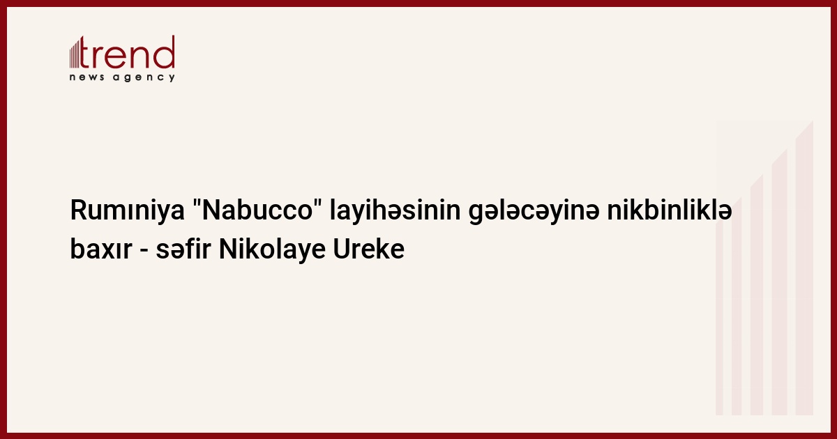 Rumıniya "Nabucco" qaz kəməri layihəsinin gələcəyinə nikbin baxır. Bunu cümə günü Rumıniyanın Azərbaycandakı fövqəladə və səlahiyyətli səfiri, NATO-nun ölkədəki nümayəndəsi Nikolaye Urke səfirlərlə keçirilən müntəzəm görüşlər çərçivəsində Azərbaycan Prezidenti Yanında Strateji Araşdırmalar Mərkəzi tərəfindən təşkil olunmuş görüş zamanı deyib. "Nabucco" layihəsi qazın Xəzər regionundan və Yaxın Şərqdən Aİ ölkələrinə nəqlini nəzərdə tutur.