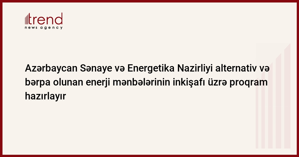 Azərbaycan Sənaye və Energetika Nazirliyi yanında Alternativ və Bərpa Olunan Enerji Mənbələri üzrə Dövlət Agentliyi bu sahənin inkişafına dair proqramın hazırlanması prosesini başa çatdırır. Bu barədə çərşənbə axşamı sənaye və energetika naziri Natiq Əliyev bildirib.