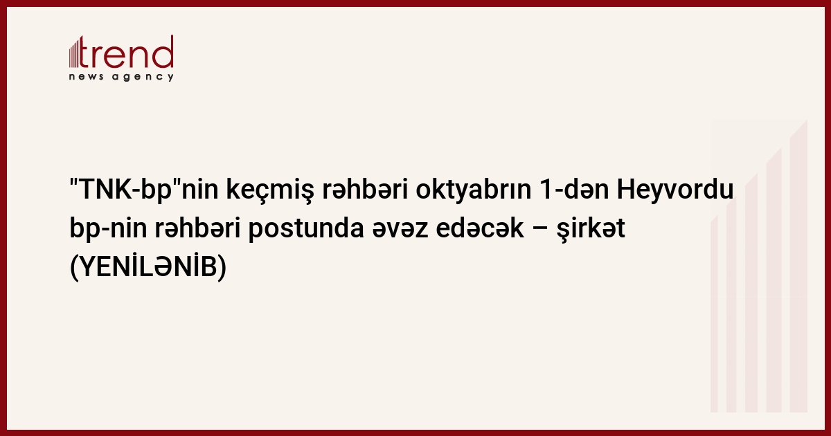 bp şirkəti, Direktorlar Şurasının qarşılıqlı razılaşması əsasında, Toni Heyvordun baş icraçı direktor vəzifəsindən getdiyini elan edib. 2010-cu il oktyabrın 1-dən başlayaraq onu Robert Dadli əvəz edəcək. Bu barədə bp-nin məlumatında deyilir.