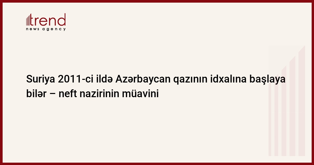 Suriya 2011-ci ildə Azərbaycandan qaz idxalına başlaya bilər, lakin dəqiq tarix hələ müəyyən olunmayıb. Bu barədə Trend-ə Suriyanın neft nazirinin müavini Həsən Zeynəb deyib.