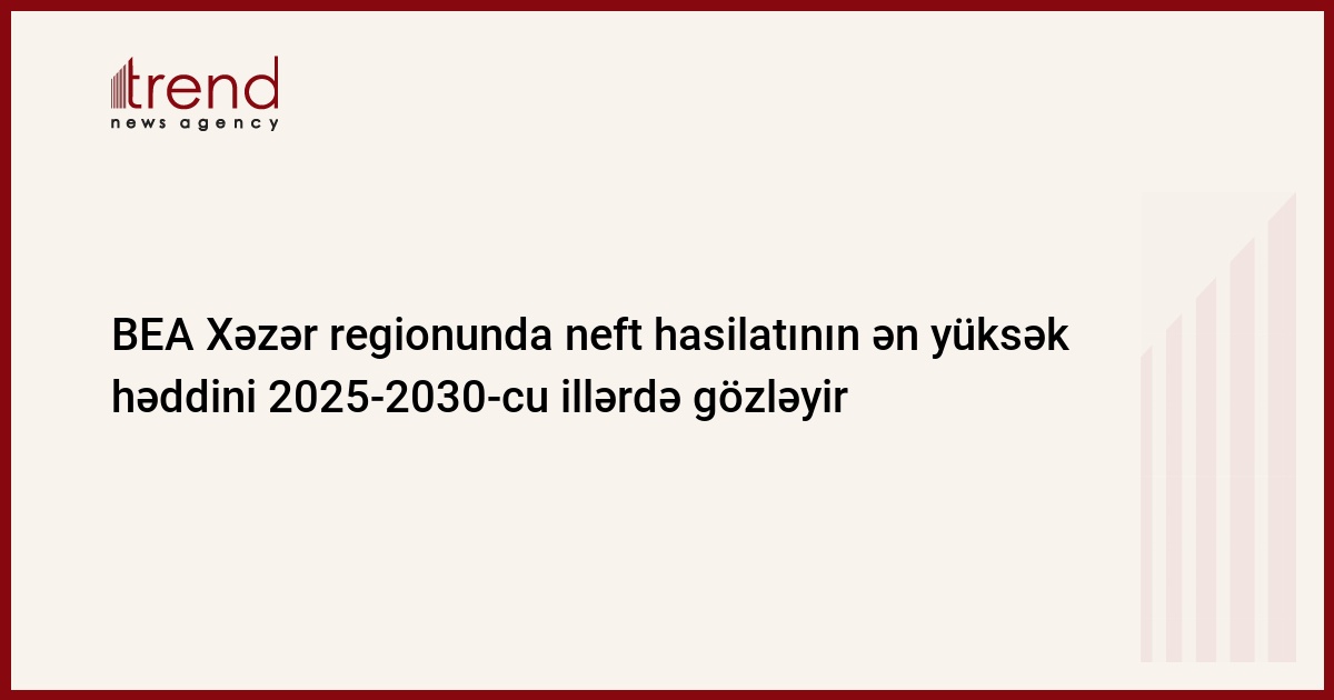 Beynəlxalq Energetika Agentliyi (BEA) Xəzər regionunda neft hasilatının ən yüksək hasilat həddinə - sutkada 5,4 milyon barelə 2025-2030-cu illərdə nail olunacağını proqnozlaşdırır. Məlumatda deyildiyi kimi, 2009-cu ildə hasilat həcmi 2,9 milyon barel təşkil edib.