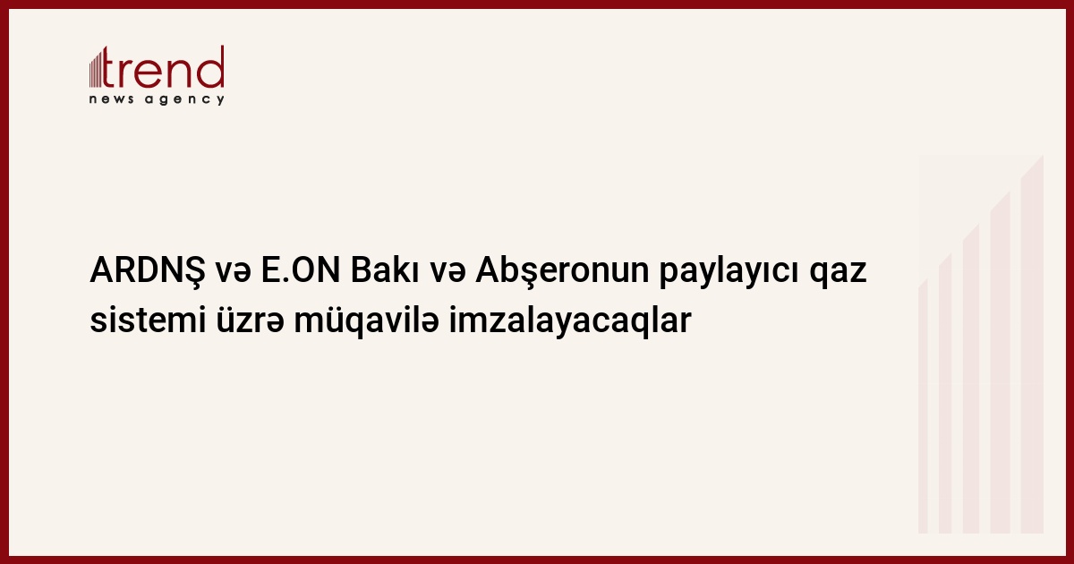 ARDNŞ (Azərbaycan Respublikası Dövlət Neft Şirkəti) və Almaniyanın E.ON şirkəti ilin sonunadək Bakı və Abşeron yarımadasının paylayıcı qaz sisteminin texniki-iqtisadi əsaslandırmasının hazırlanması, layihələşdirilməsi (qaz kəmərlərinin uzunluğunun ölçülməsi), yenidən qurulması və modernləşdirilməsi üzrə müqavilə imzalayacaq. Bu barədə Trend-ə bazar ertəsi "Azəriqaz" İB-nin rəhbəri Əkbər Hacıyev deyib.
