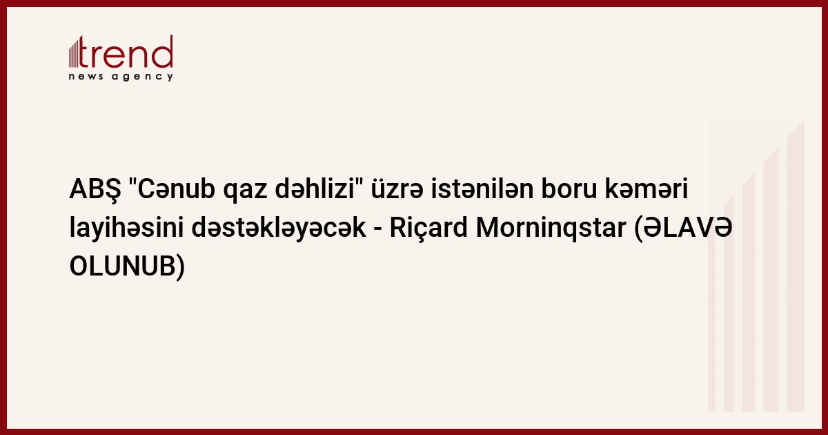 ABŞ "Cənub qaz dəhlizi" çərçivəsində istənilən boru kəməri layihəsini dəstəkləyəcək. Trend-in məlumatına görə, bu barədə çərşənbə axşamı ABŞ dövlət katibinin Avrasiya enerji məsələləri üzrə xüsusi nümayəndəsi Riçard Morninqstar Bakıda keçirilən mətbuat konfransında bildirib.