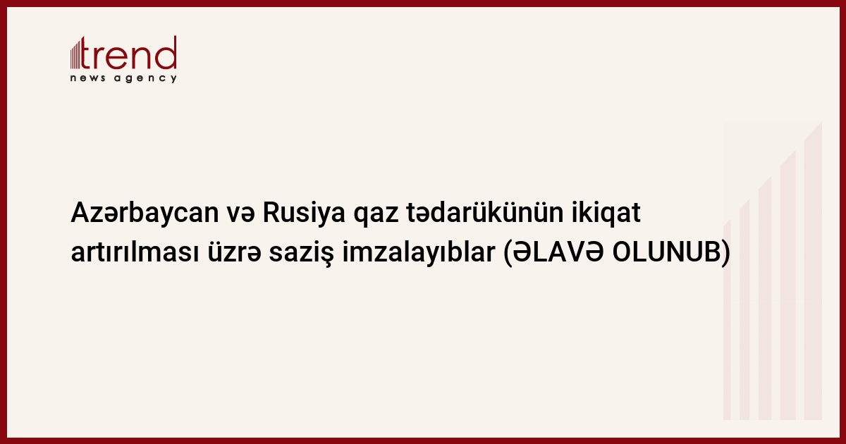 Rusiyanın "Qazprom" şirkəti ilə ARDNŞ (Azərbaycan Respublikası Dövlət Neft Şirkəti) 2012-ci ildə Azərbaycan qazının alışının 2 dəfə, yəni 3 milyard kubmetrədək artırılmasına dair əlavə saziş imzalayıblar. Bu barədə bazar ertəsi Trend-ə "Qazprom"un mətbuat xidmətindən məlumat verilib.