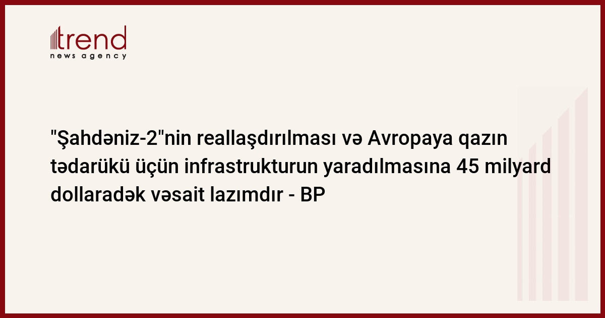 Xəzərdə Azərbaycanın "Şahdəniz" qaz-kondensat yatağının ikinci mərhələsinin işlənməsinin reallaşdırılması və Avropaya qazın tədarükü üçün bütün zəruri infrastrukturun yaradılması üçün investisiyaların həcmi 40-45 milyard dollar təşkil edə bilər. Trend-in məlumatına görə, bu barədə çərşənbə günü BP-nin Azərbaycan, Gürcüstan və Türkiyə üzrə prezidenti Rəşid Cavanşir Bakıda keçirilən "Xəzər neft, qaz, neftayırma və neft kimyası" (Caspian Oil and Gas) konfransı zamanı bildirib.